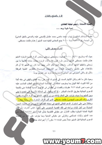 قدم الدكتور إيهاب ماضى زوج شقيقة رجل الأعمال هشام طلعت مصطفى، إقرارا بالتنازل والصلح إلى المستشار أحمد دعبس رئيس نيابة المعادى، وذلك فى البلاغ المقدم منه ضد شقيق زوجته اتهمه فيه بالتعدى عليه أثناء زيارته له فى سجن المزرعة أول شهر رمضان الماضى.