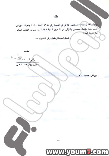 وأضاف أنه بعد إجراء التحقيقات قد ثبت حقه مما يستوجب إحالة هشام طلعت إلى المحاكمة الجنائية فى البلاغ رقم 15697لسنة2010 جنح المعادى وتوقيع العقاب عليه وفقاً للمادة 242من قانون العقوبات. إلا أنه نظراً للعلاقة الأسرية التى تجمع بينهما، رأى تقديراً لذلك ولذكرى والدهم المرحوم "طلعت مصطفى" الذى يكن له كل الاحترام وحفاظاً منه على استمرار الدعم العائلى للمتهم فى محنته واتهامه فى قضية مقتل الفنانة سوزان تميم، أن يتقدم بذلك التصالح والتنازل عن جميع الحقوق المدنية على الدعوى الجنائية.